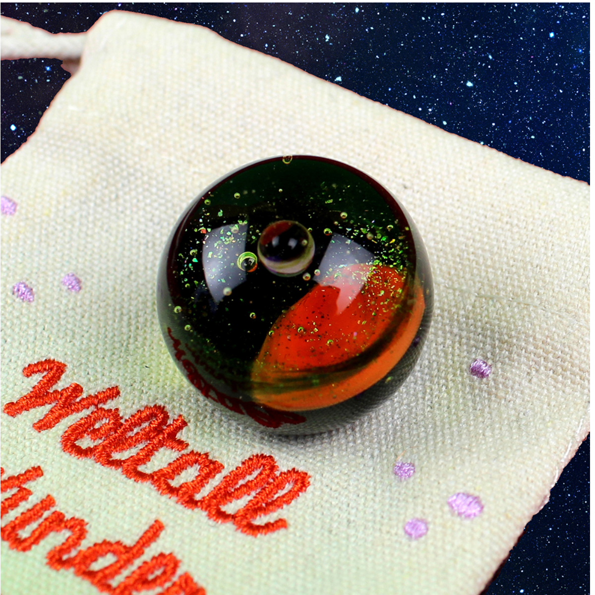 Jede Glasmurmel wird von Hand gefertigt und zeigt Weltraum-Motive wie Sterne, Planeten und kleine Galaxien – perfekt für Kinder, die den Kosmos lieben, und für alle, die besonderes Spielzeug mit Stil suchen.