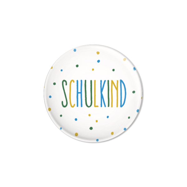 Ava & Yves Button Schulkind „Konfetti“ blau. Ein super schöner Button für alle Schulkinder. Ein tolles Geschenk zum 1. Schultag und passt perfekt in jede Schultüte.