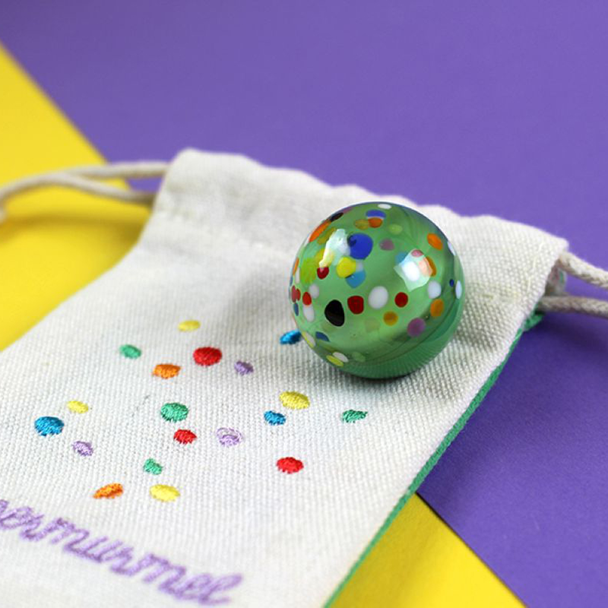 Supermurmel grün aus Muranoglas (grün mit Konfetti-Steinchen) 25mm, in hochwertigem Stoffbeutel mit Stickerei