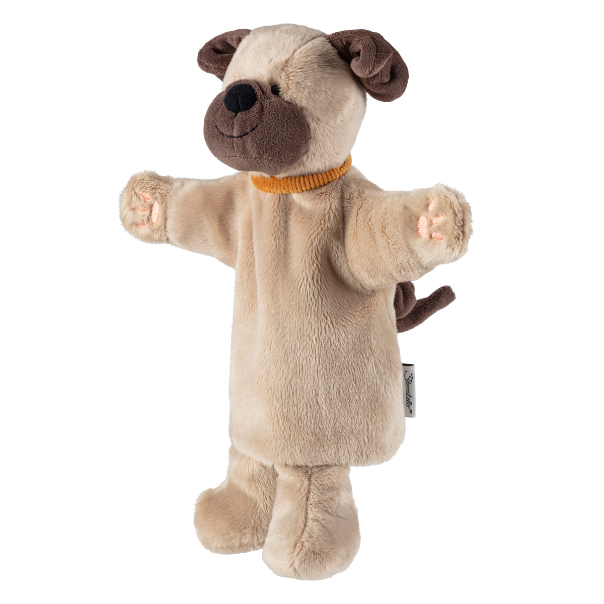 Handpuppe Hund aus weichem Plüsch mit Klappohren und Ringelschwanz, süßem Halsband und Pfotenstickeri.
