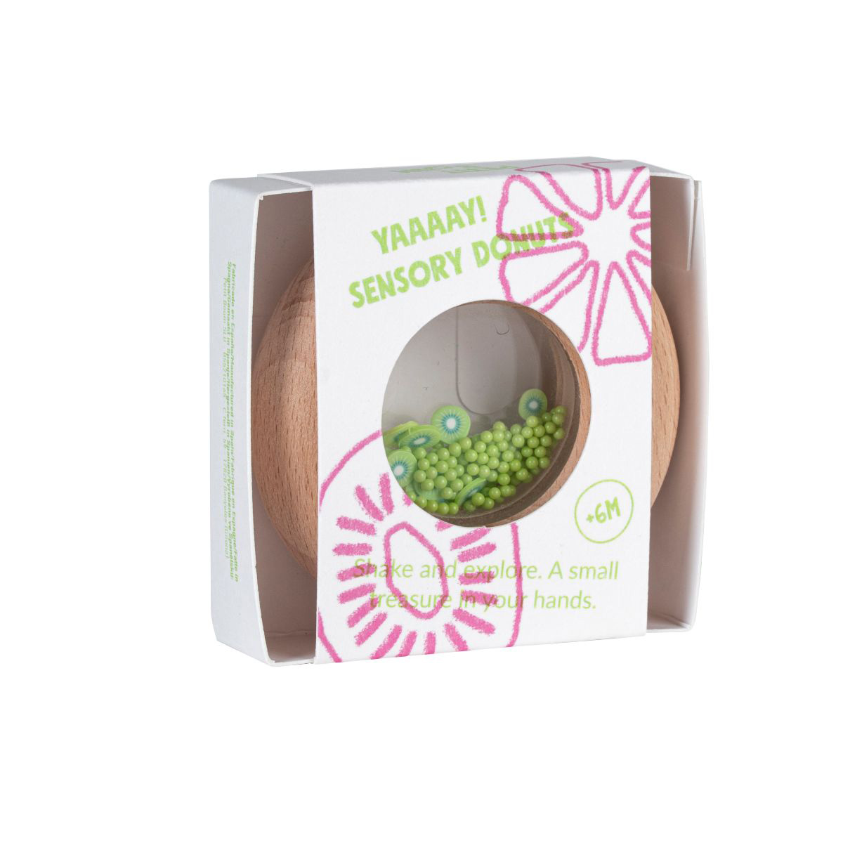 Das neue Sinnesspielzeug wird selbst die Kleinsten begeistern. Es ist eine donut-förmige Holzrassel, die perfekt für kleine Kinderhände geeignet ist. Im Inneren befinden sich Obst- und Gemüsefiguren, die beim Schütteln den unwiderstehlichen Klang erzeugen. Obwohl sie zum Anbeißen verlockend aussieht, ist sie aus natürlichem, ungiftigem und bissfestem Buchenholz gefertigt.