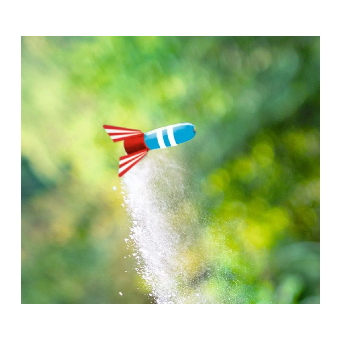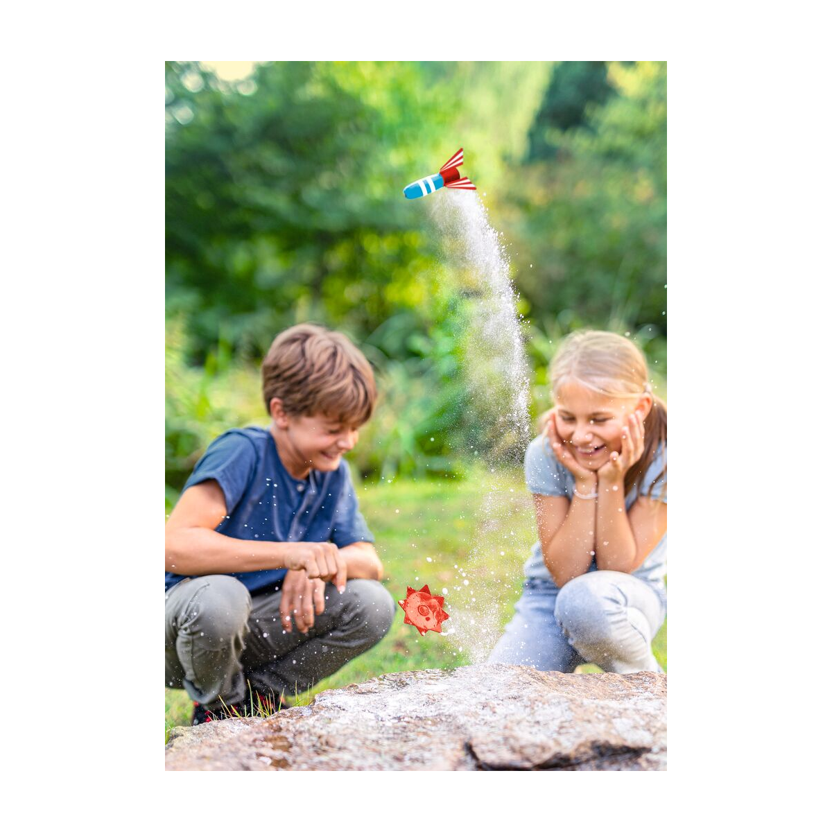 3, 2, 1… und los! Diese coole Rakete ist sofort startklar. Als Treibstoff werden nur zwei simple–– Zutaten aus der Küche benötigt, und schon schießt die Rakete von der Station: Einfach Haushaltsessig und Backpulver hinzufügen und die rotblaue Kunststoffrakete startet ihren Flug. Doch wie kann das funktionieren? Im Inneren der Verpackung wird kindgerecht erklärt, welche chemische Reaktion die Rakete fliegen lässt und welche Rolle CO₂ dabei spielt. Spielspaß und Wissensvermittlung werden hier spannend kombiniert!