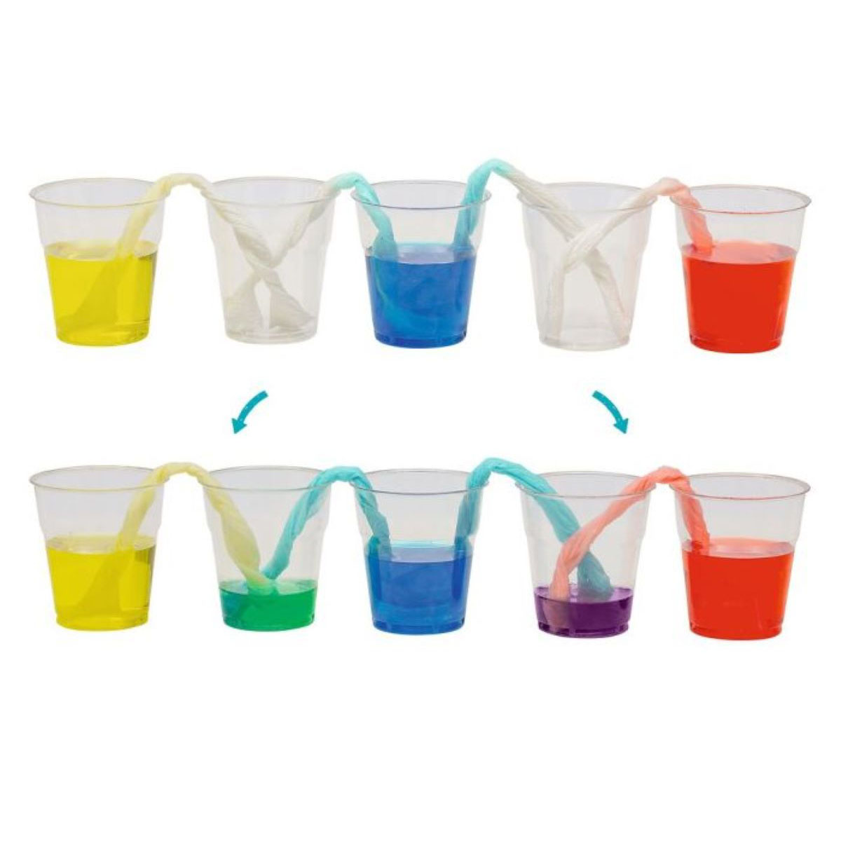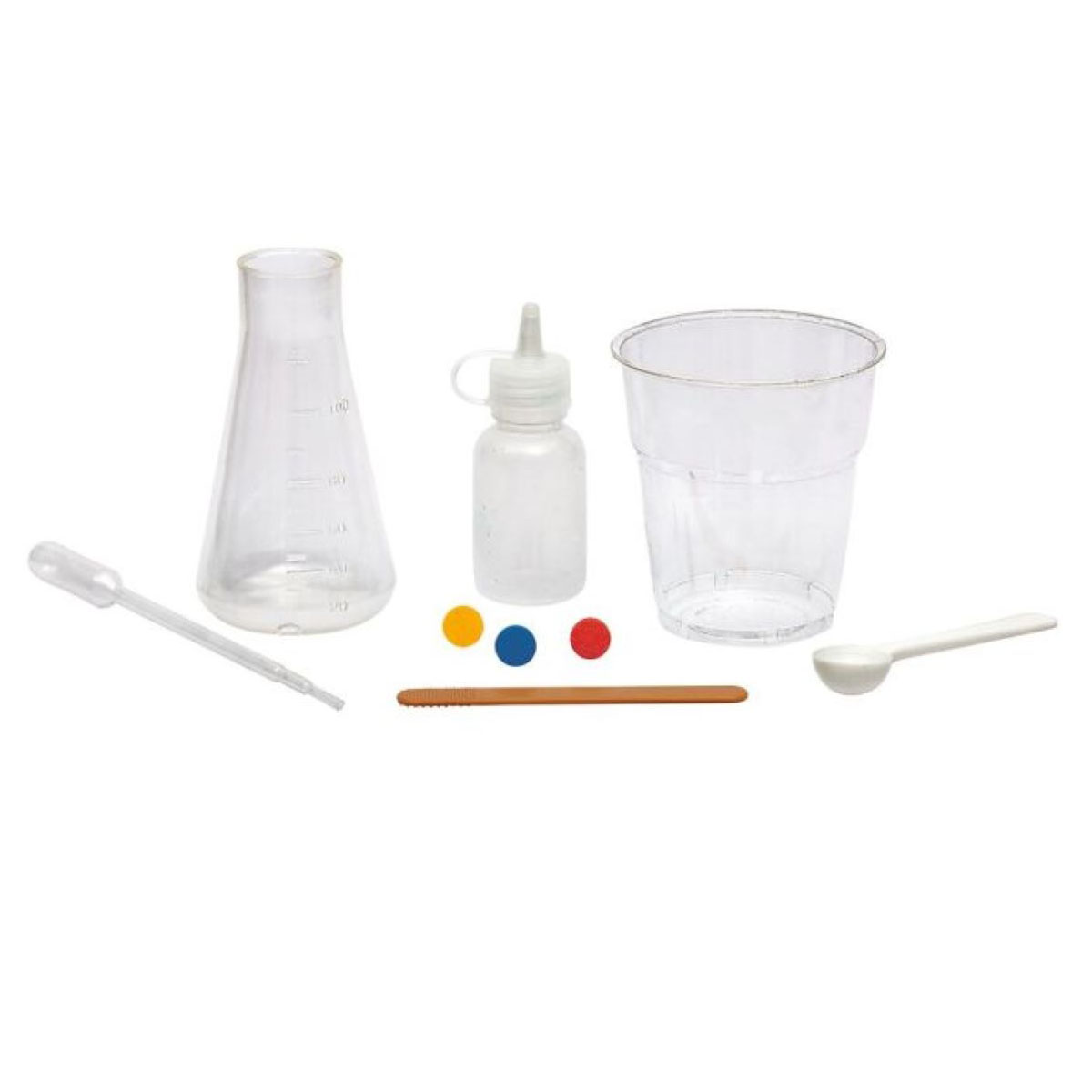 + mit verschiedenen Farbtabletten, 3 Fläschchen, 6 Plastikbechern, Pipette, Erlenmeyerkolben, Rührstab, Portionierlöffel, Anleitung und Hintergrundinformationen zur additiven Farblehre