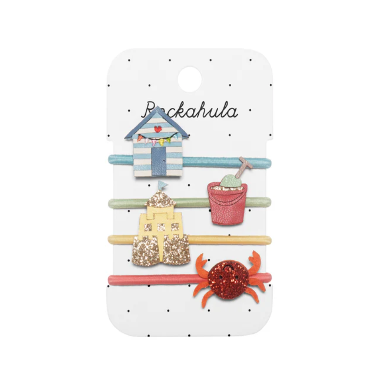 Dieses Set mit vier Haargummis ziert alles, was den Strandspaß ausmacht. Mit der gestreiften Strandhütte, einem Eimer mit Schaufel, einer süßen Krabbe und einer glitzernden Sandburg –