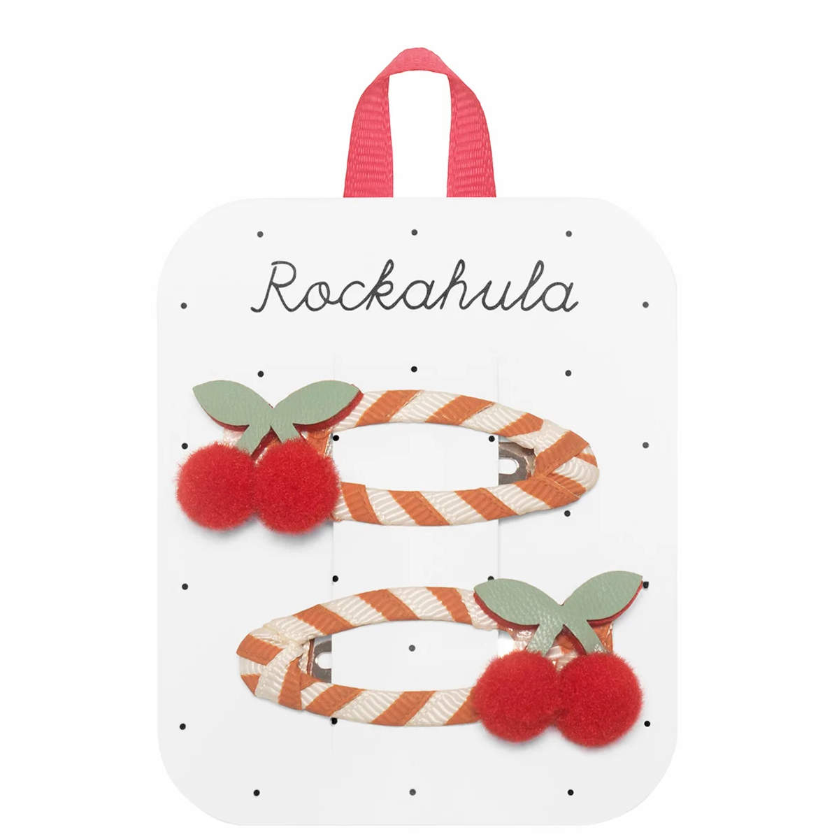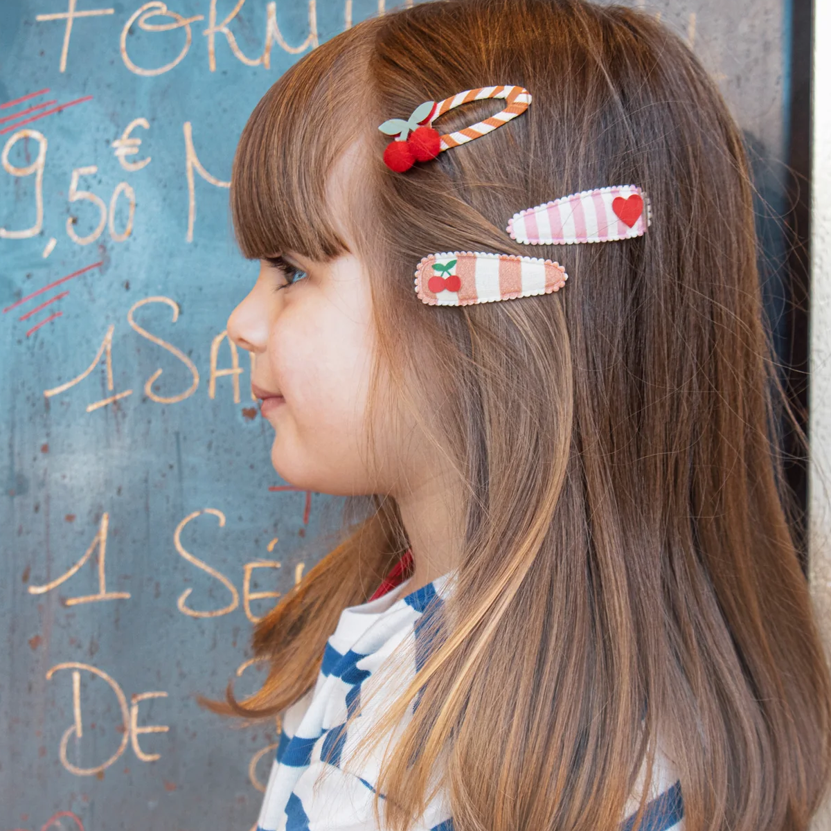 Süße Kirschen zieren diese mit gestreiftem Band umwickelten Haarclips. Jede Kirsche hat detaillierte grüne Stiele und rote Pompomfrüchte.