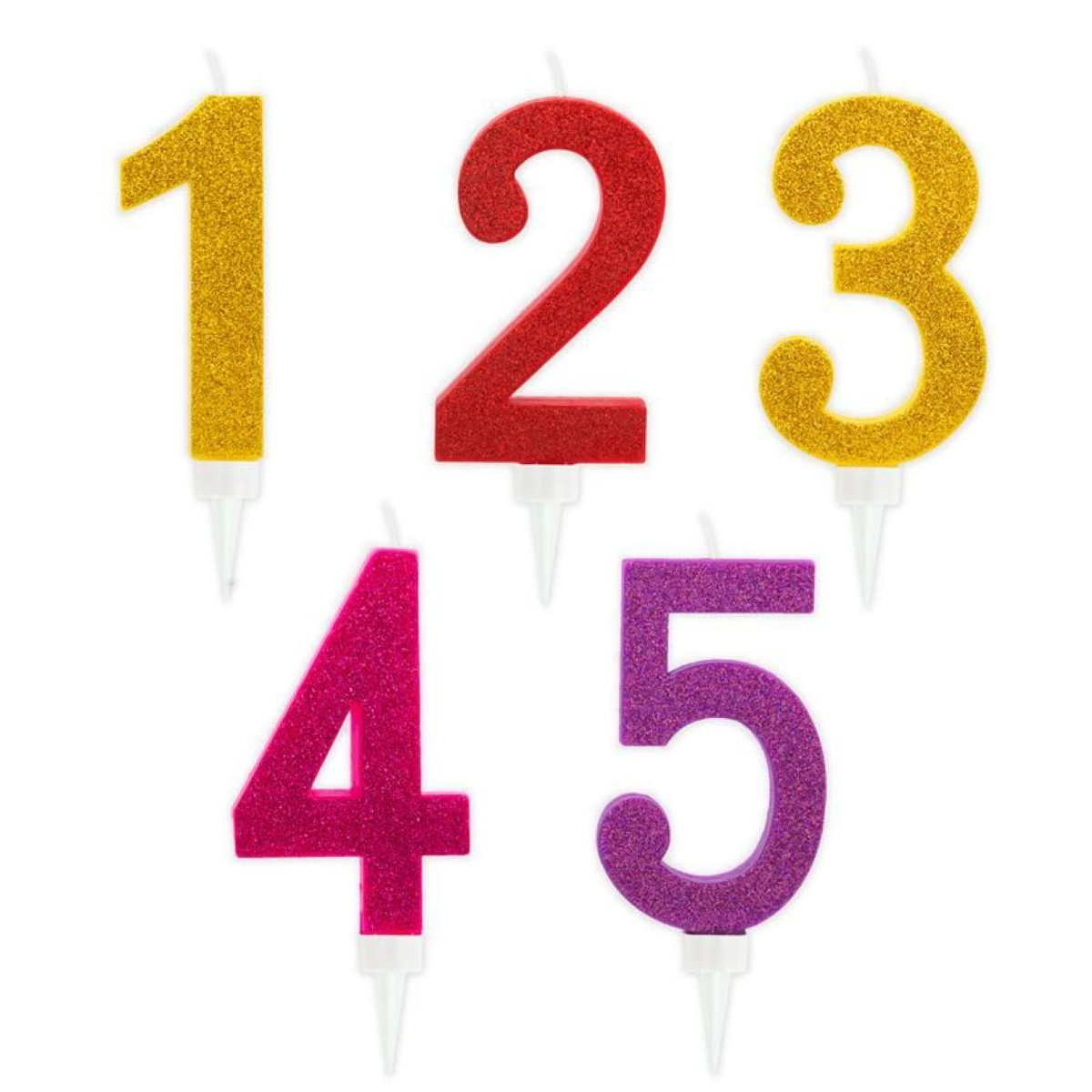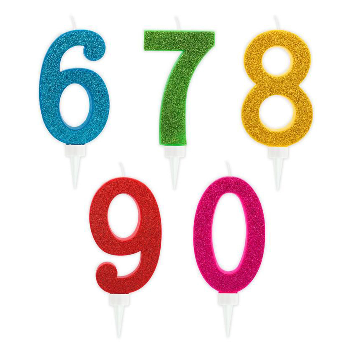 Bunte Zahlenkerzen mit Glitter von 0-9 sortiert in verschiedenen Farben.