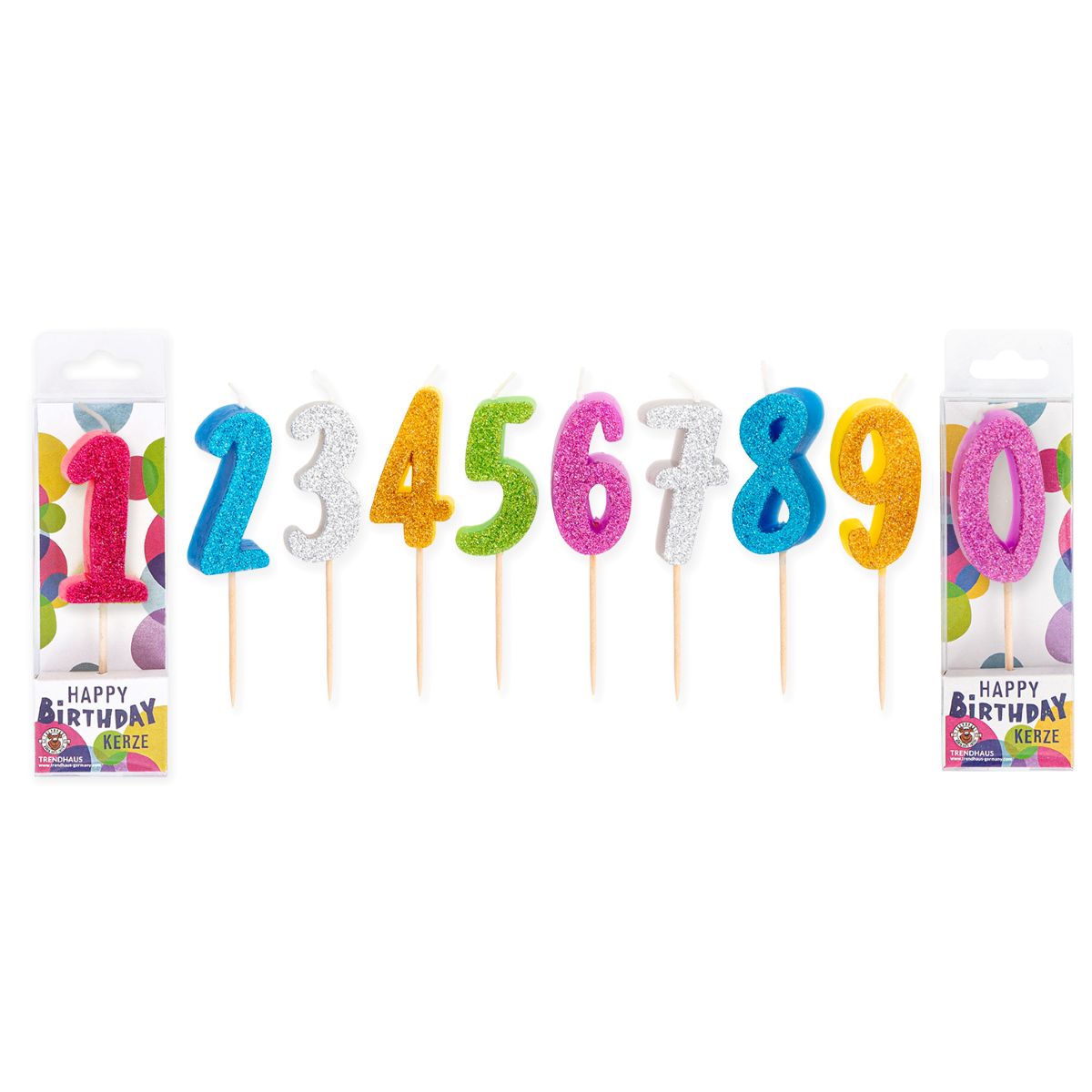 Bunte Zahlenkerzen mit Glitter von 0-9 sortiert in verschiedenen Farben.